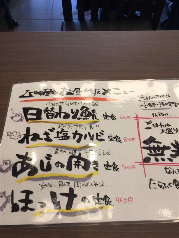 残念ながら、一番安い日替わり鯖(800円)は売切れ~。ホッケは日曜日に食べたし、ひもの屋に来てネギ塩カルビもな~。と消去法でアジの開きに決定