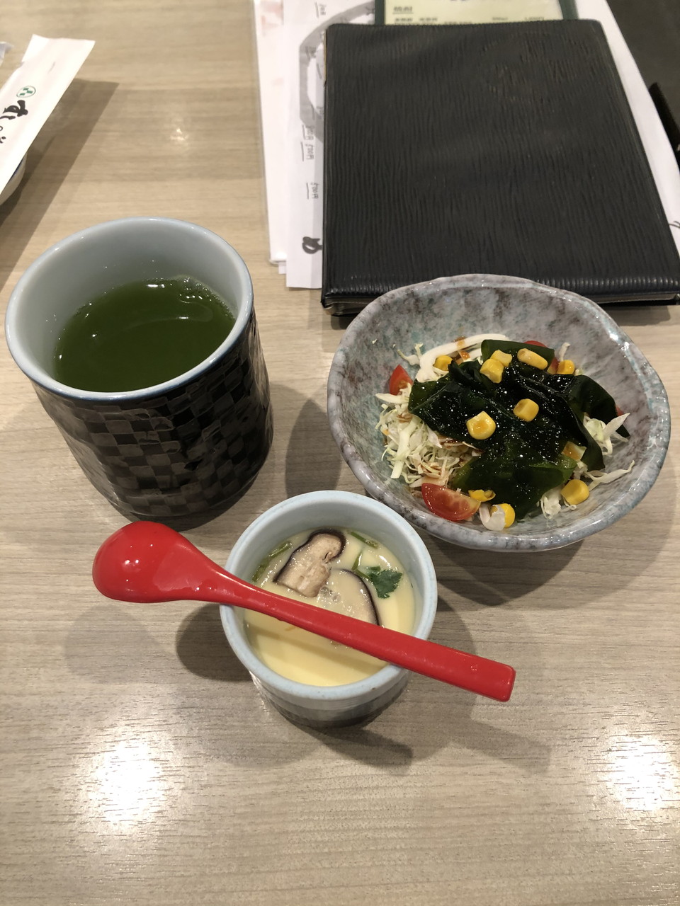 最初にサラダ・お茶・茶碗蒸しだけ出てくるのでムシャムシャ。