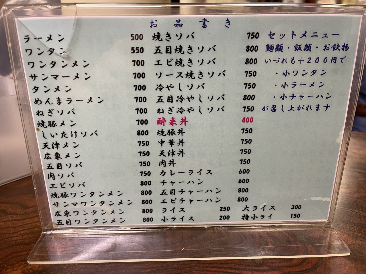 400円ぽっきり!酔来丼(叉焼・メンマ・もやし・目玉焼き)@酔来軒(すいらいけん)@阪東橋 2021年9月13日 に admin が投稿 400円ぽっきり!酔来丼(叉焼・メンマ・もやし・目玉焼き)@酔来軒(すいらいけん)@阪東橋 酔来軒 町中華という感じ。食べログ百名店にも選ばれているらしい。 昔なつかし食品サンプル しかし、酔来丼(すいらいどん)推しがスゴいな…。 メニューも、これだけ赤字(苦笑) なんでこんなに安いのか?と聞いてみたら「手間かかってないからね~」との事。 けっこう色々なメニューがあるのね。 注文したら一分足らずで出てきた、早い~! 食べ方を聞いてみたら「タレをかけて卵かけご飯みたいにグチャグチャにして食べて」 全部タレをかけたら、ちょっと味が濃かったけど、これで400円は激安! 関連記事 銀座スケベニンゲンのフリッタータ(ミートソースに卵を絡めて焼いた、1000円)、普通に「ミートソース+目玉焼き」にした方が美味いのでは…。 恒例の熱海TRPG旅行に行って来ました! kickstarterからfove(200人限定、349ドル)送るから、欲しい色と住所を教えろ〜とメールが来た。 嫁へのプレゼント