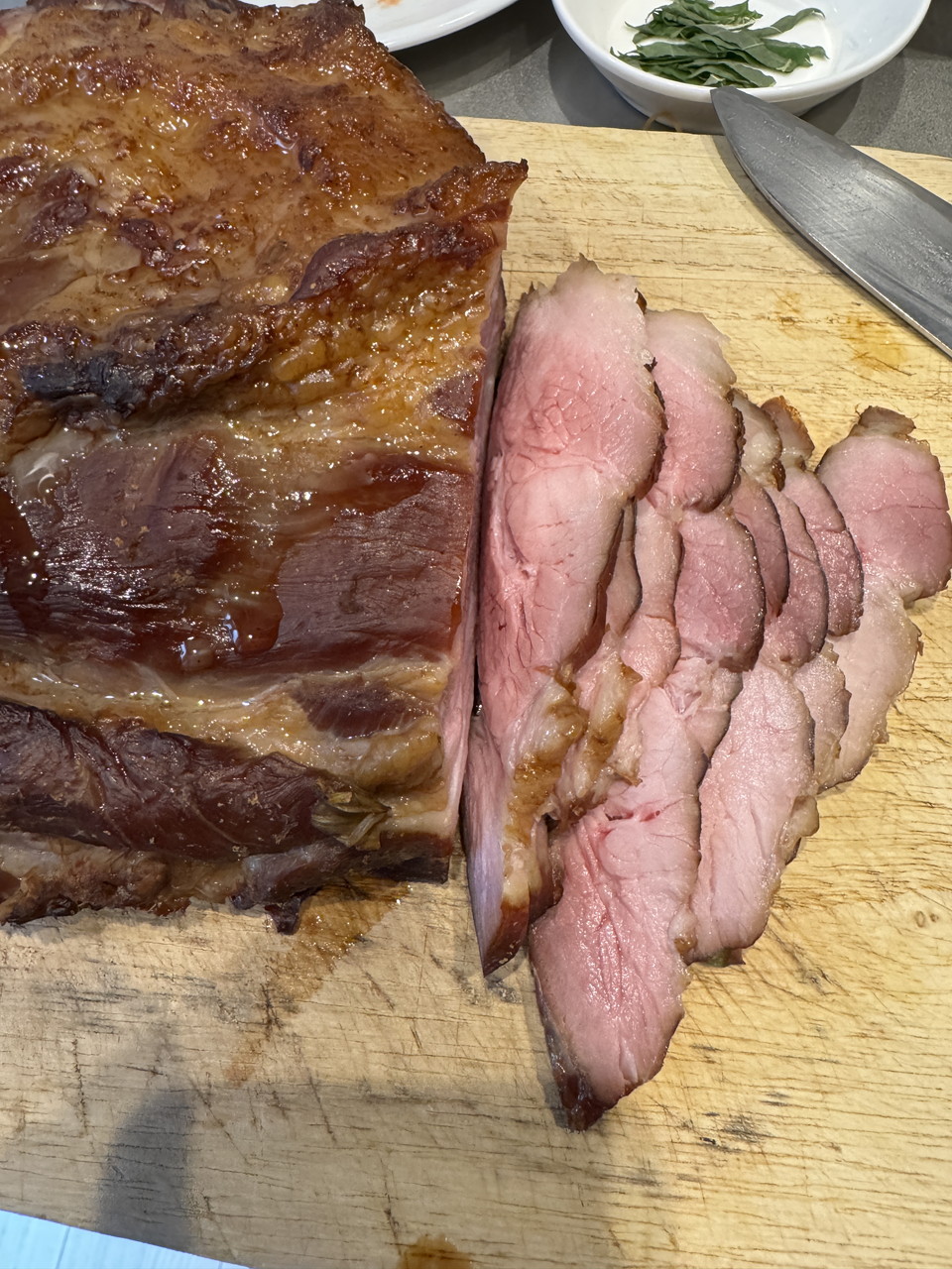 肉のハナマサで豚ウデ肉4kg(3440円)を買って、焼き豚を作ってみた! 2025年6月10日 に admin が投稿 肉のハナマサで豚ウデ肉4kg(3440円)を買って、焼き豚を作ってみた! 100g税込86円は安い! 流石に4kgは多すぎる(パック内の肉はロール状になってた)ので、3分割くらいにして半分以上は冷凍した。 醤油・酒・みりん・オイスターソース・生姜・ニンニク・長ネギの漬け汁に60時間ほど漬け込んで オーブン150度で2~3時間ローストしてみた。 豚ウデ肉は筋が多いけど、低温調理で柔らかくジューシーでウマい! 漬け汁も加熱してタレにしよう。 加熱するとアクや長ネギがスゴイので、味噌こしで濾す。 すっきり透明感のあるタレになった。 野菜と一緒にチャーシュー丼にして食べようとしたら、上の子がちょうど帰ってきたので、そのまま彼の夕飯に・・・。 関連記事 池袋北口にある中華食材店「中国食品友誼商店」で豚の頭(半身で1134円)を買って、姿煮を作ってみた! 「とびだせ! おすし」を買って、家で寿司を作ってみた。 LODGE(ロッジ)のスキレット(鋳鉄製の分厚いフライパン)を買って、ステーキを焼いてみた! 築地土産につきぢ味幸堂(みゆきどう)で、西京焼き切り落としミックス(450gで1100円)を買って、オーブントースターで焼いてみた。 500円ランチパスポート(新橋・虎ノ門)を買って、500円ランチを満喫! 本マグロの「身あらブロック」が、なんと100円で売っていたので、刺身と生姜焼きにして食べてみた(^_^)/