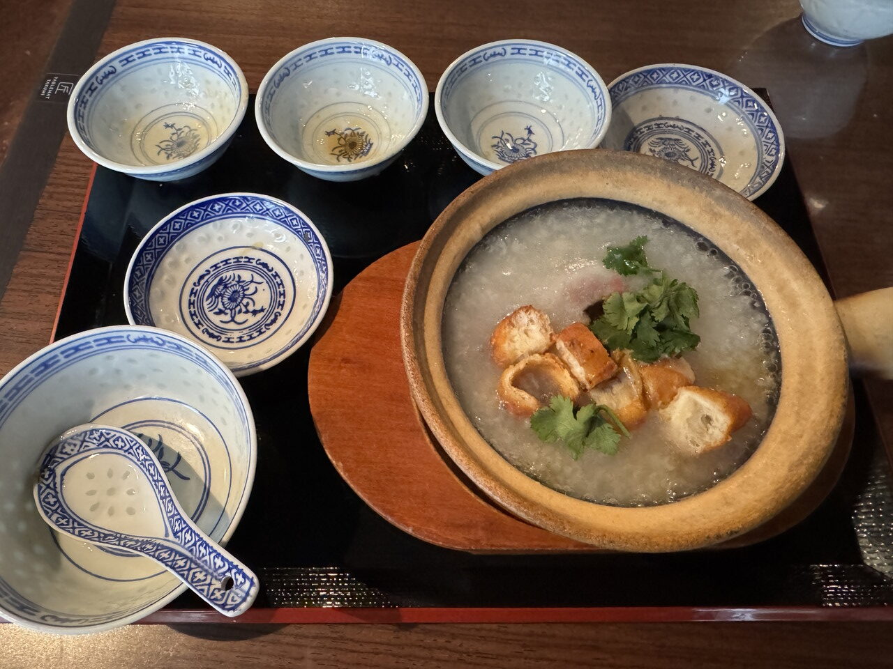 注文10分くらいで到着。揚げパン、ピータン、ごま油、臭豆腐、パクチーを自分で入れてくださいとの事。