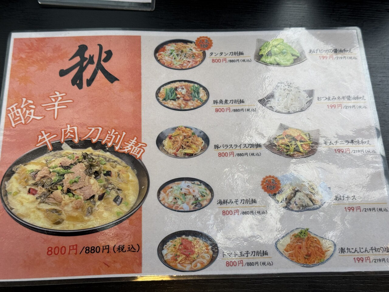 次回来たら、人気TOPって書かれている「タンタン刀削麺880円+揚げナス219円」にしよう。