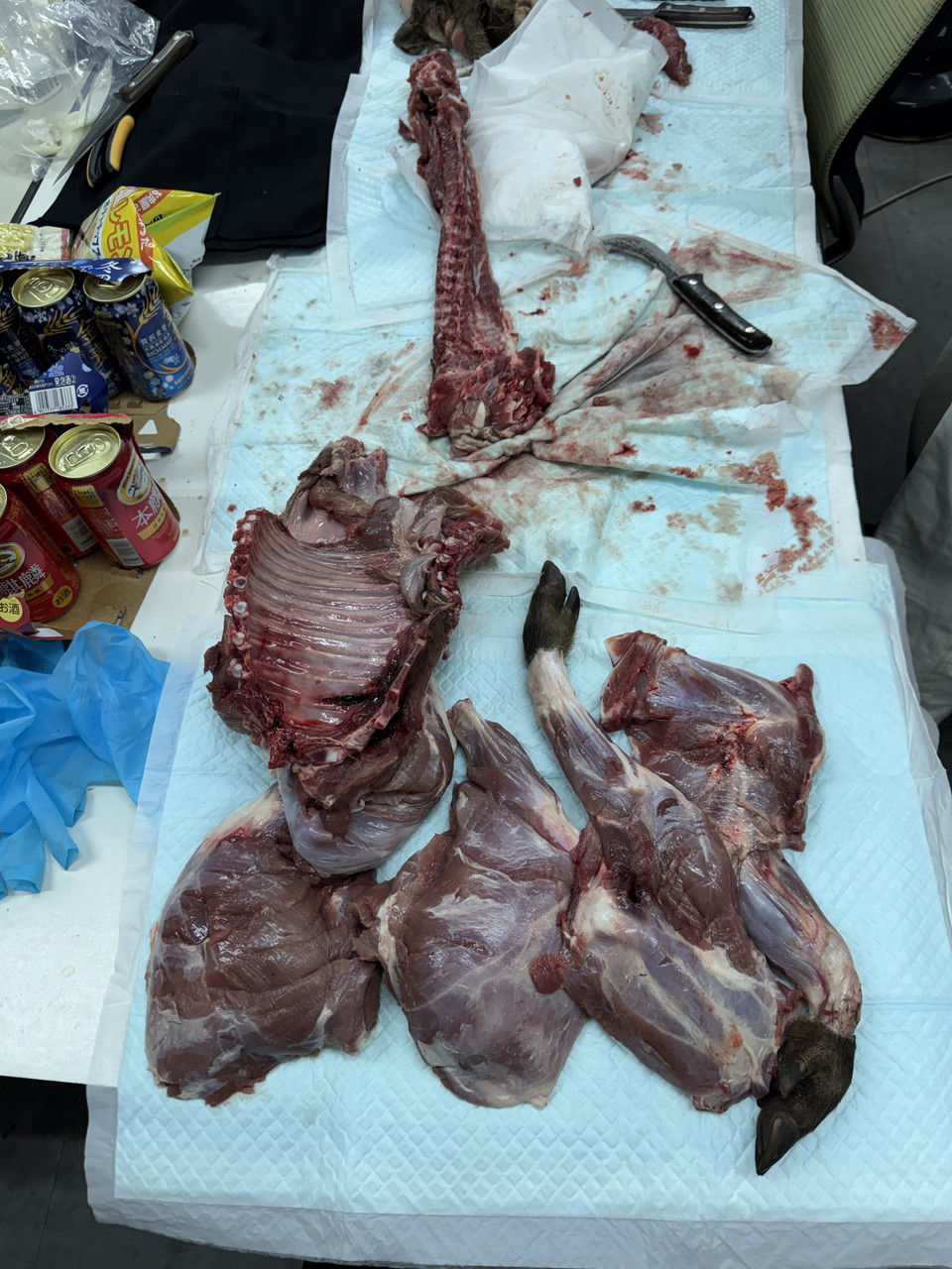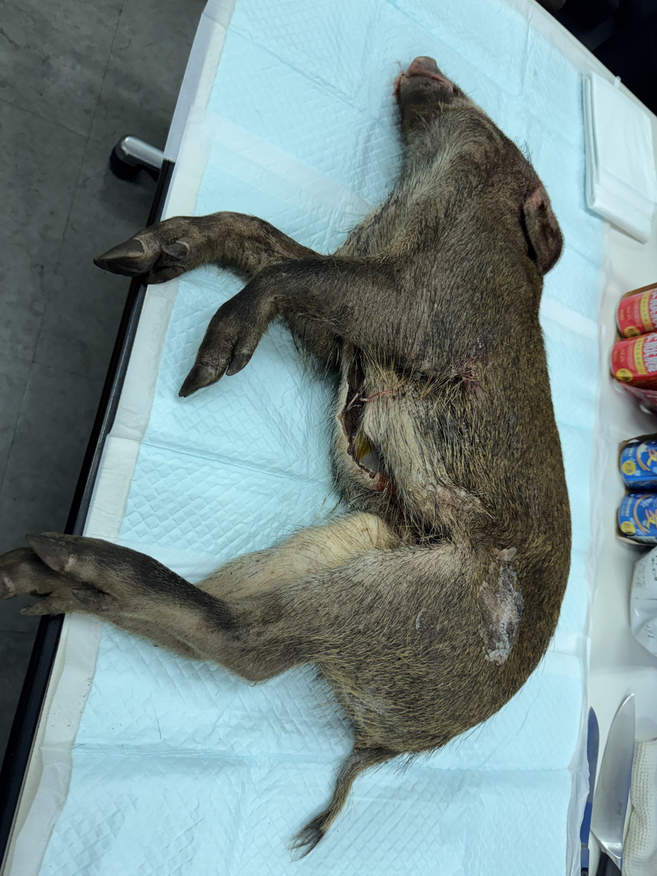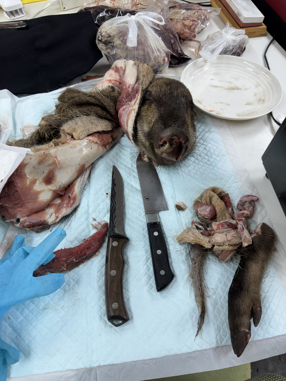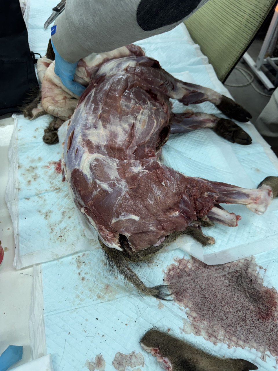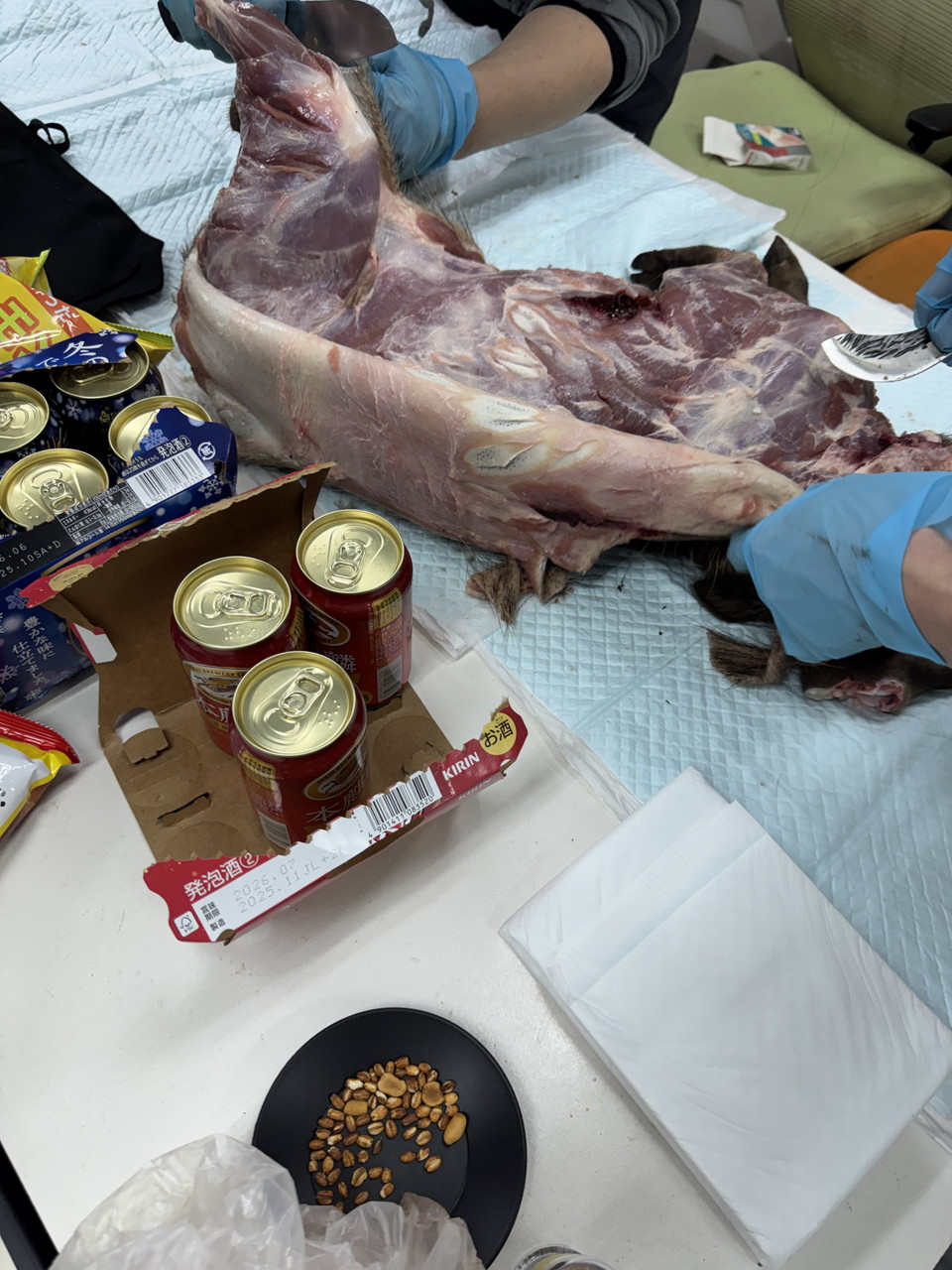 シェアハウス「EngineMaker」で狩猟ジビエ忘年会があったので、小さいイノシシの皮剥ぎをしてみた。