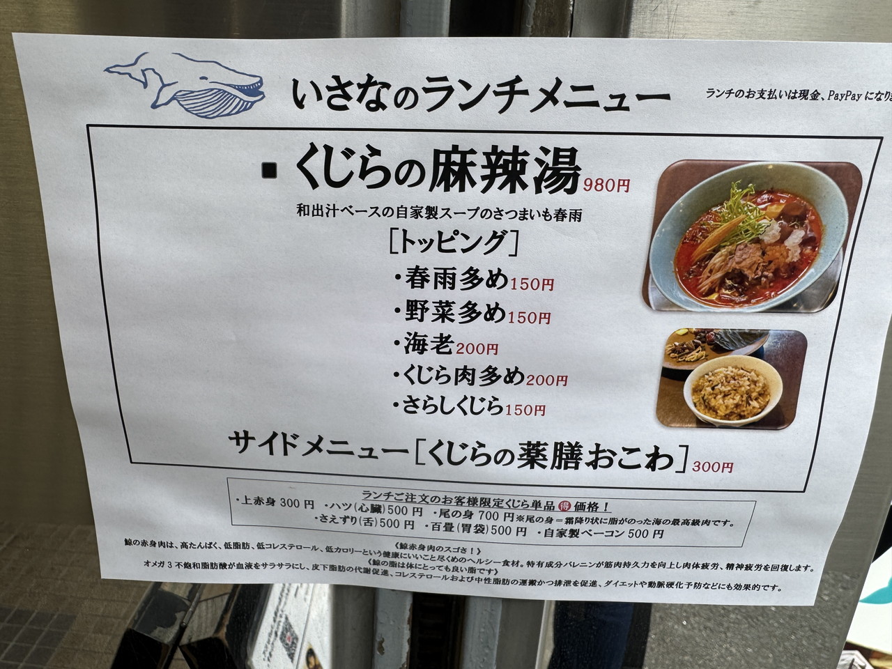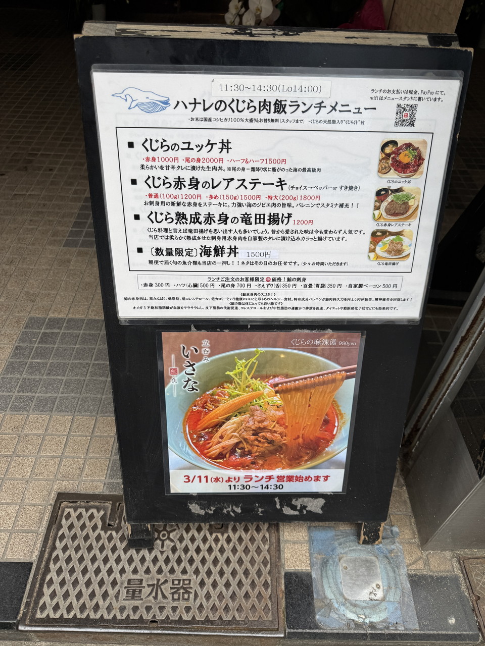 くじら麻辣湯980円+おこわ300円@立呑み いさな(クジラ料理専門の立ち呑み屋)@西新橋 2026年3月19日 に admin が投稿 くじら麻辣湯980円+おこわ300円@立呑み いさな(クジラ料理専門の立ち呑み屋)@西新橋 立呑み いさな 2階もクジラ料理専門店、前に行ったな。 くじら赤身と尾の身のWユッケ1500円@鯨の離れ@西新橋。馬刺しとマグロの中間みたいで美味い。 新規開店なので、お祝いの花が並べられている。 トッピングも色々あるけど、最初なのでノーマルで 鯨肉も食べられる。 昼間から飲めるらしく、隣の人はビール飲んでた。 どっちも鯨肉が入っていると言われても、分からない…。 麻辣湯の方は、牛肉の切れっ端みたいなのが鯨肉? 関連記事 くじら赤身と尾の身のWユッケ1500円@鯨の離れ@西新橋。馬刺しとマグロの中間みたいで美味い。