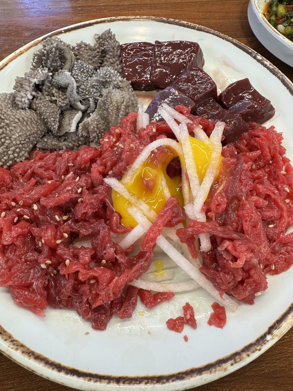 ユッケの下に梨の千切りが敷いてあるのが韓国流。