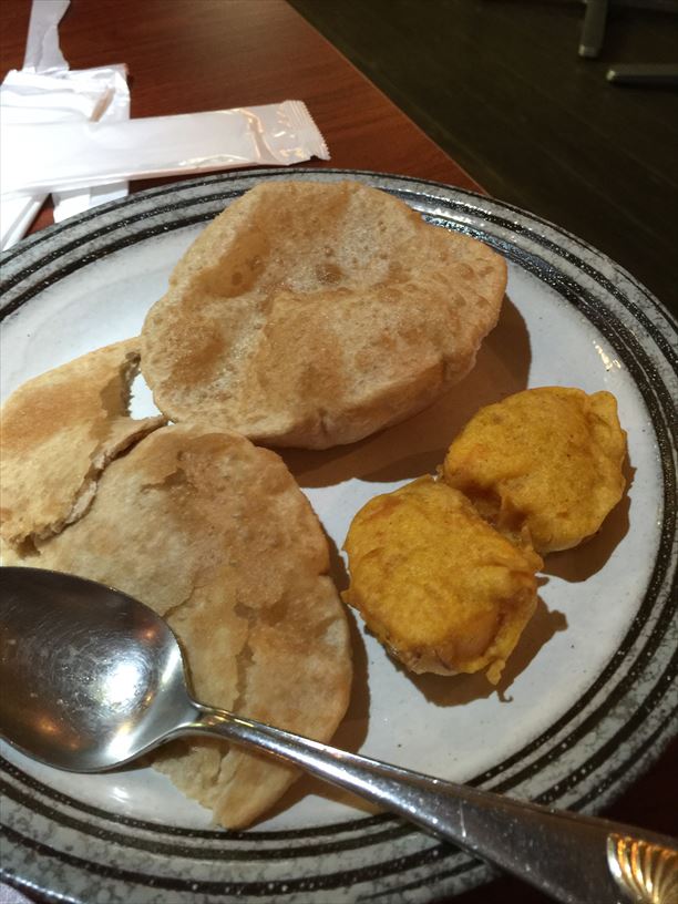 奥のキッチンから追加で来た、チャパーティーとスナック(ゆで卵のフライ)